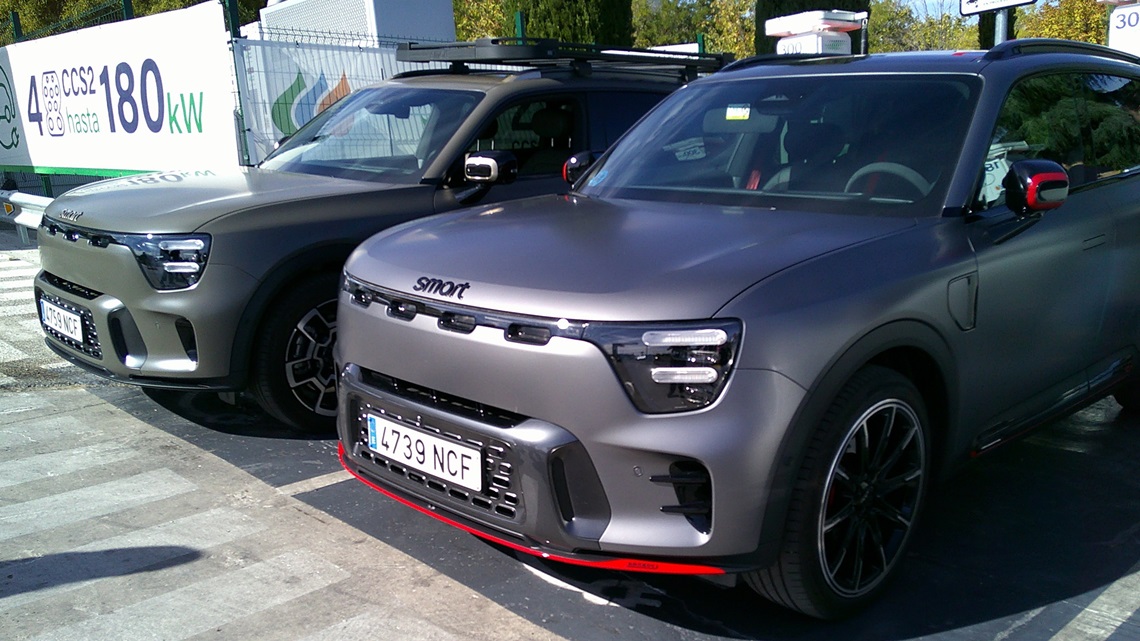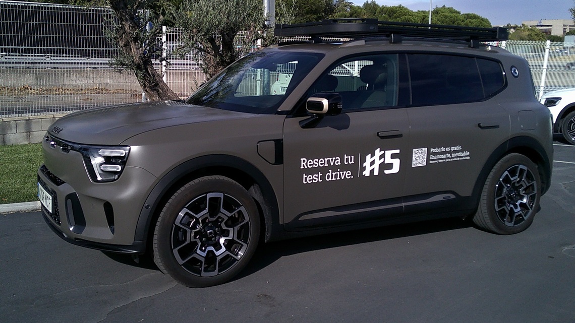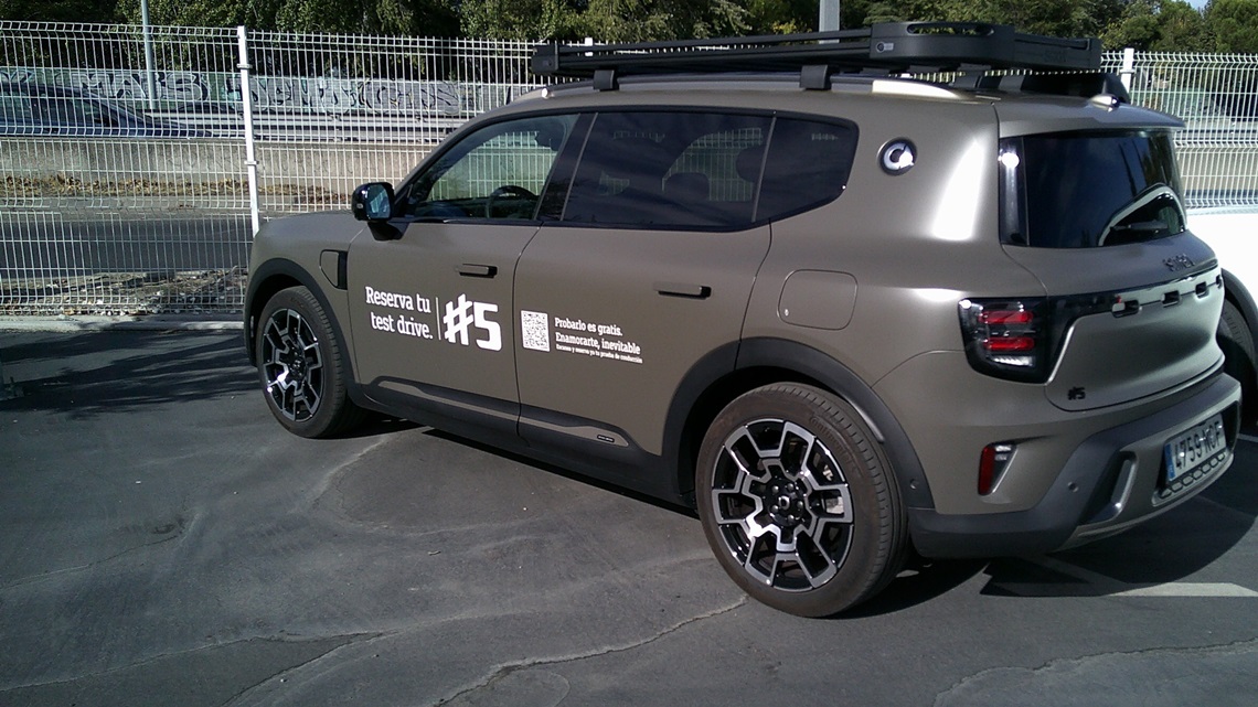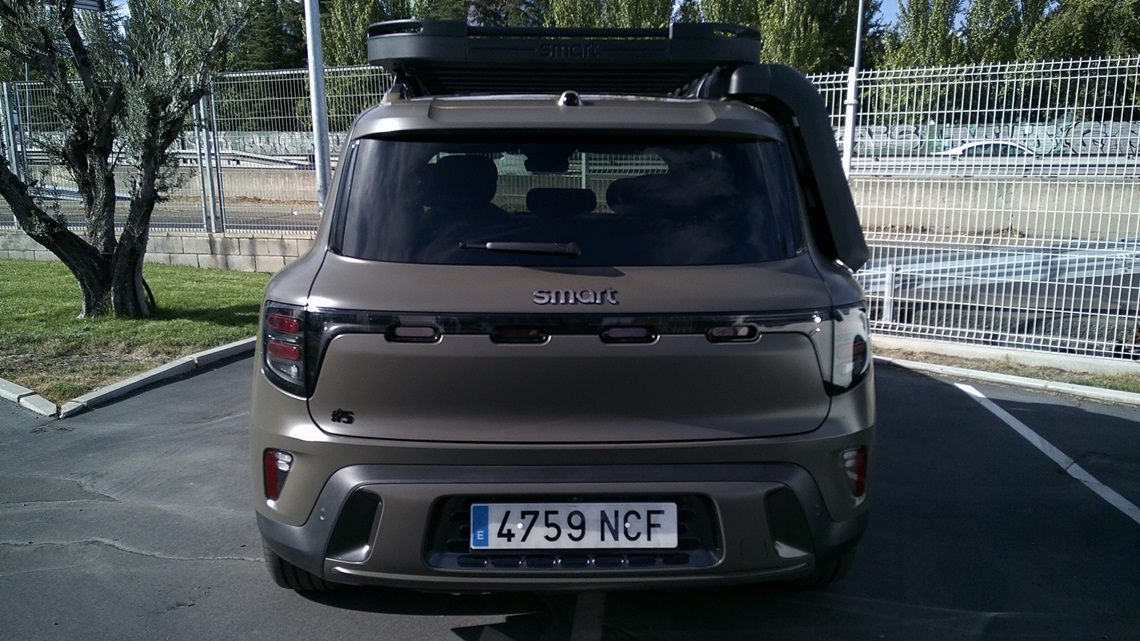 Por fuera el smart #5 su silueta y presencia es más una reminiscencia de los antiguos Mercedes Clase M que un GLC cupé actual como pudiera ser el smart #3, eso sí, el del acabado Summit Edition, como fue el de la unidad que elegí para este primer abordaje, es el más campero de todos ya que, desde la escalera para ascender al techo hasta el soporte para montar, por ejemplo, una tienda de campaña, pasando por la posición lo más alejadas entre sí de sus ruedas, las propias llantas y, sobre todo, un frontal que recuerda bastante a otros conocidos (conocido 1, conocido 2) en el ámbito de los SUV con aspiraciones off-road o, directamente, todoterrenos, el morro del «etiqueta 5» mola mucho.